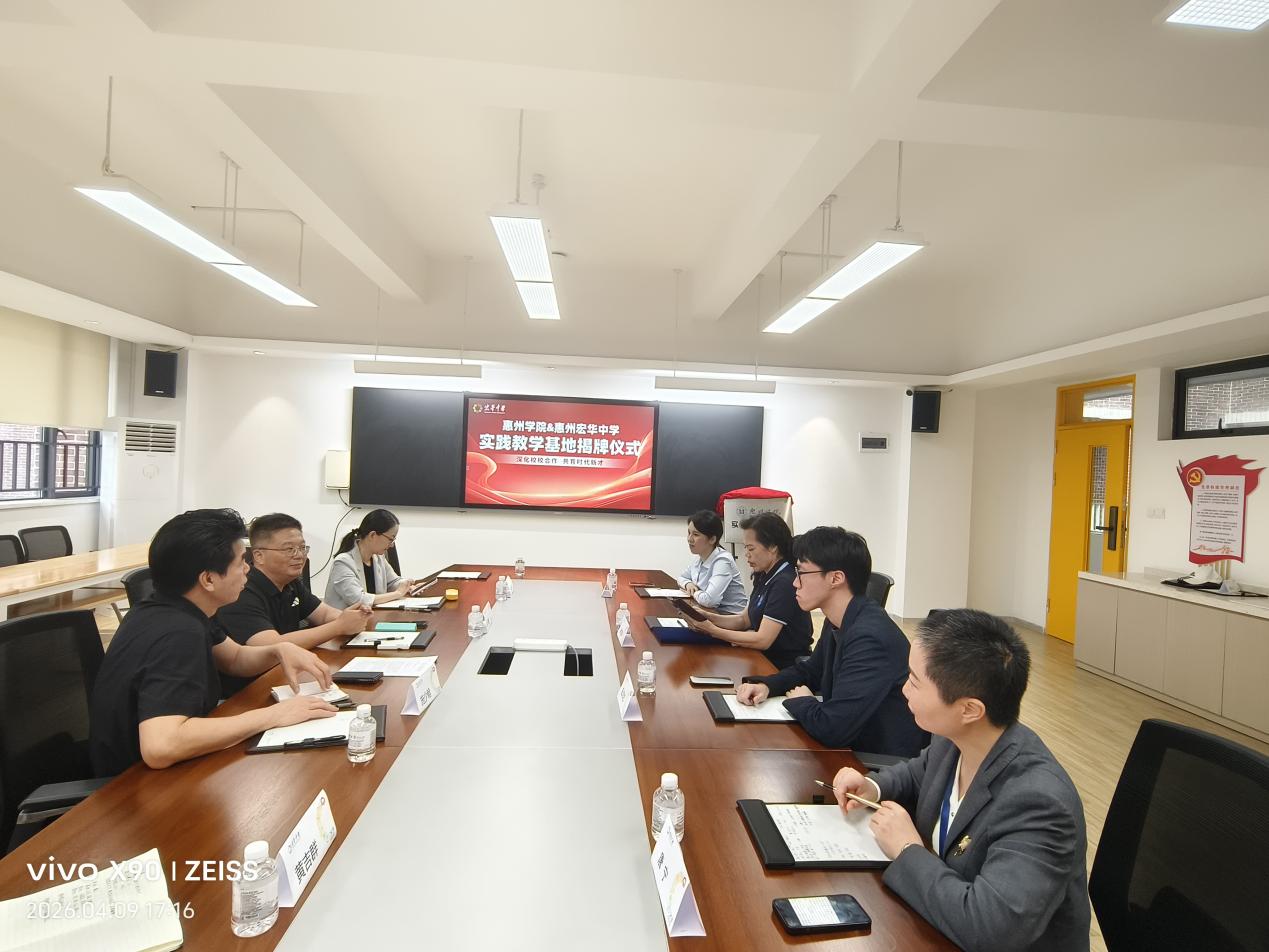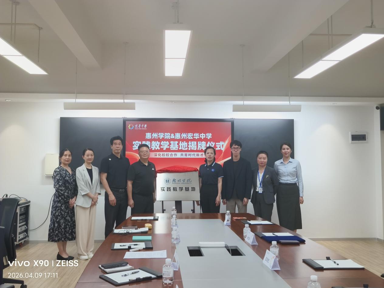 4月9日下午,惠州学院教务部部长蒋辉带队赴惠州仲恺宏华中学举行实践教学基地揭牌仪式。我院党委副书记施少翰、副院长卜凌云、教务员黄吉群参加了此次活动。宏华中学徐雪萍副校长、李川主任等出席了揭牌仪式。